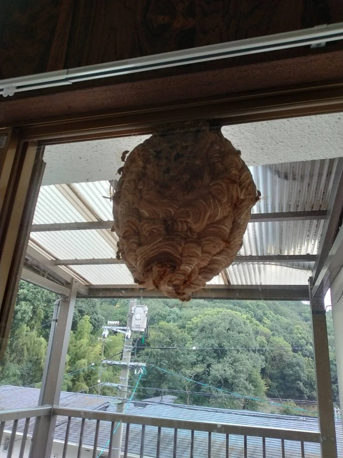 住宅のベランダに 50cm ほどのスズメバチの巣ができていました。
