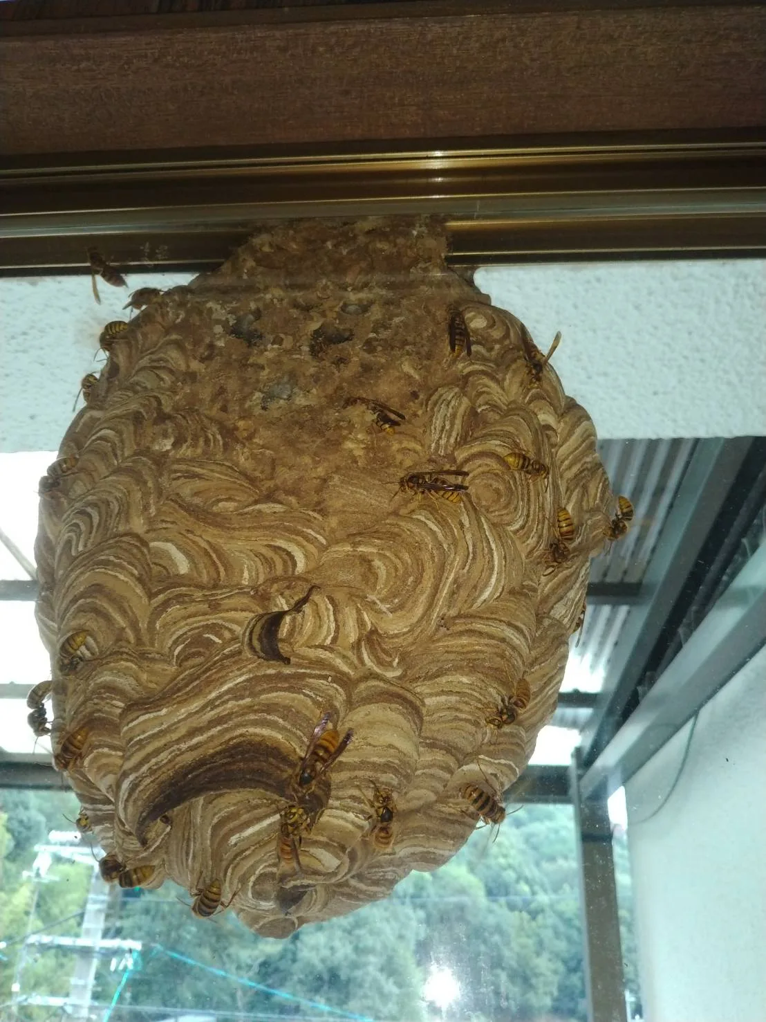 一戸建ての2階のベランダ部分の屋根に大きな巣ができています。駆けつけた時も、多くの蜂が動き回って、巣を拡張していました。早く駆除したい状況です。